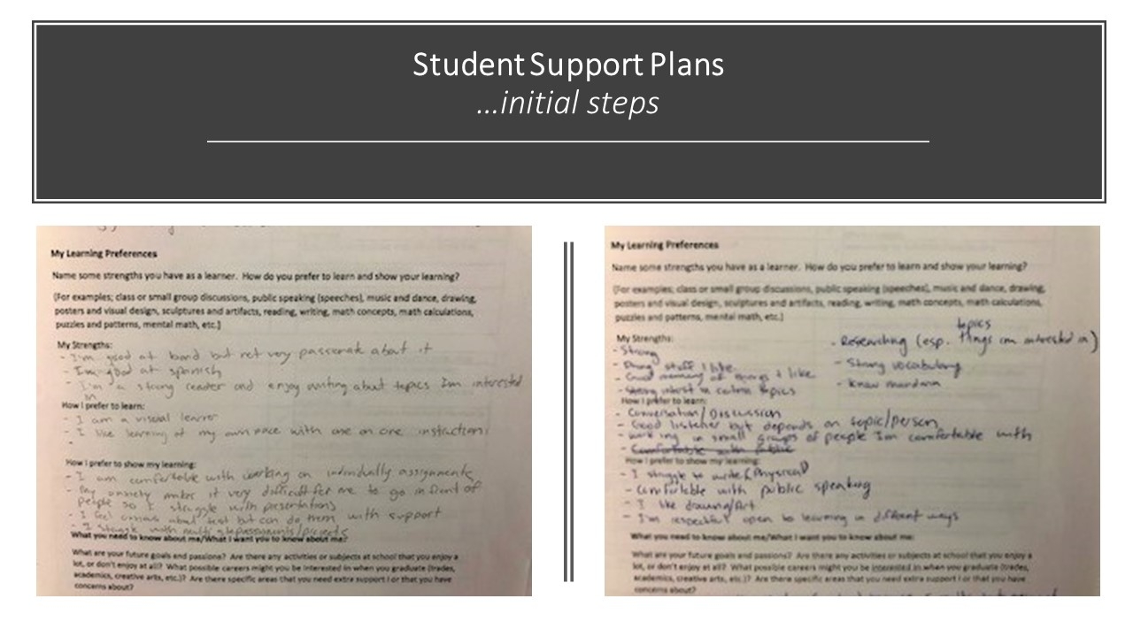Student Support Plans are a part of our school culture. These plans initiate our focus on student self awareness and self management. Students, alongside staff, build and use these plans to help guide the student's academic and personal learning journey.