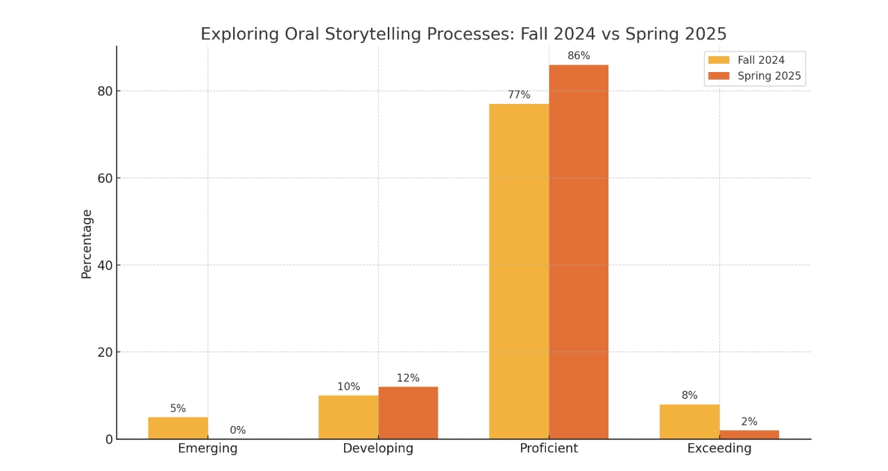 In Fall 2024, the majority of students (77%) were proficient in oral storytelling, with 10% developing, 5% emerging, and 8% exceeding expectations. By Spring 2025, proficiency increased to 86%, with a decrease in emerging learners to 0%, and a slight rise in those exceeding to 2%. This data indicates steady growth in students' oral communication skills and narrative structure development. Moving forward, the goal is to increase the percentage of students exceeding expectations by providing more opportunities for expressive language, audience engagement, and storytelling refinement. Our definitive literacy goal for next year is to strengthen students’ use of descriptive language and narrative sequencing to support clear, confident, and creative oral storytelling.