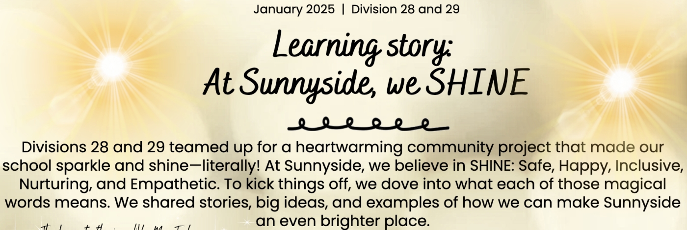 The staff at Sunnyside recognize the need to create and maintain a supportive school and classroom environment where students feel Safe and Happy. It is a school where everyone is Included and Nurtured and where we teach students to develop a sense of Empathy. At Sunnyside we SHINE!