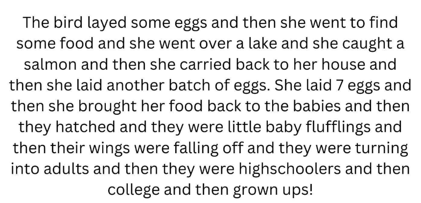 Our cohort of early childhood learners consists of vibrant and curious kindergarten students who are developing foundational language and communication skills. They are actively engaged in targeted practice focused on oral storytelling, using personal experiences, imagination, and visual prompts to share their ideas. These young learners are beginning to organize their thoughts into beginning, middle, and end structures, and are experimenting with descriptive language and dialogue. With support, they are learning to stay on topic, use complete sentences, and expand their stories with meaningful detail. Our focus remains on nurturing their confidence as storytellers while gradually increasing the complexity and coherence of their narratives.
