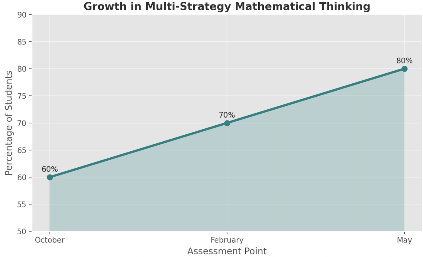 The chart below shows student progress over time through 3-Act Tasks, a problem-solving structure that promotes curiosity, estimation, and reasoning. In October, 60% of students were able to explain their thinking using more than one strategy (e.g., number lines, arrays, visual models). This increased to 70% by February and 80% by May. This growth reflects gains in flexibility, deeper reasoning, and the ability to clearly explain mathematical ideas.