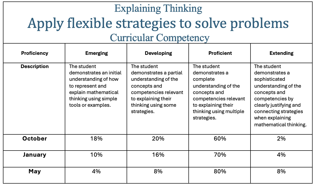 To further capture this growth, the first chart illustrates student progress using BC’s curricular language. In the competency of explaining mathematical thinking using multiple strategies, we observed a 30% increase in the number of students identified as “proficient,” rising from 60% in October to 80% in May. There was also a steady reduction in the number of students working at the “emerging” or “developing” levels.