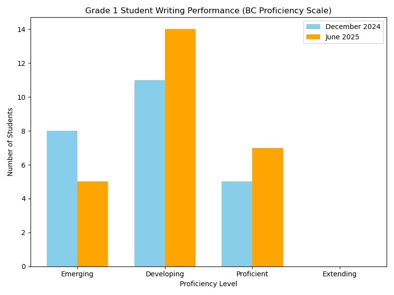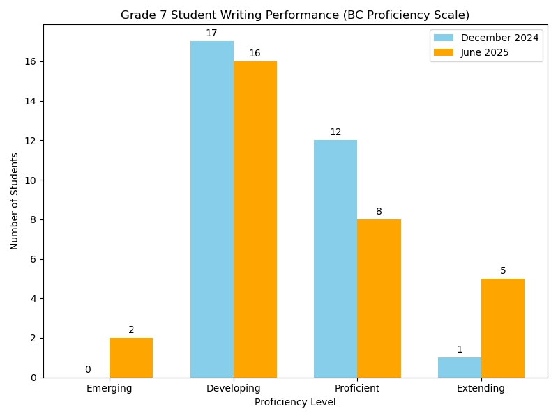 Below is the data we gathered throughout the year using the BC Proficiency Scale across the three grades for Writing.